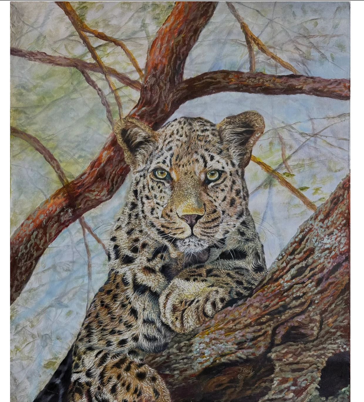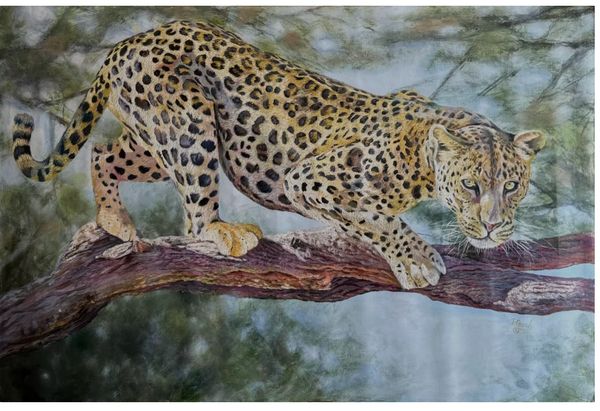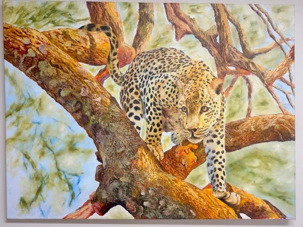31" x 46" Acrylic on Raw Canvas (mounted)Suspended between stillness and movement, this moment captures the quiet precision of instinct. The leopard moves not in haste, but in knowing. This piece invites the viewer into that same space, where awareness sharpens.