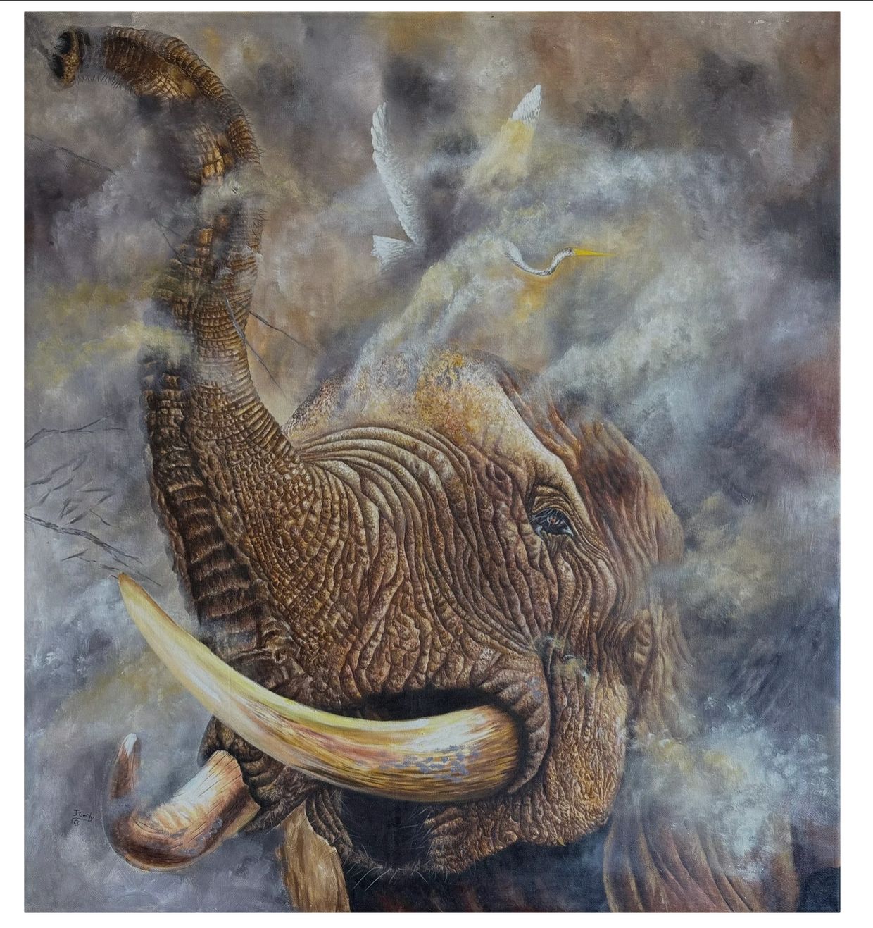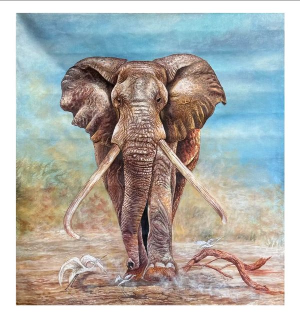 42.5" x 38.5" Acrylic on Canvas (Unframed). This breathtaking acrylic painting by Tanzanian artist Joseph Gody captures the majesty and wisdom of the elephant, framed in rising mist and accompanied by ethereal birds. The upward trunk and soulful eye invite the viewer into a moment of strength, memory, and reverence.